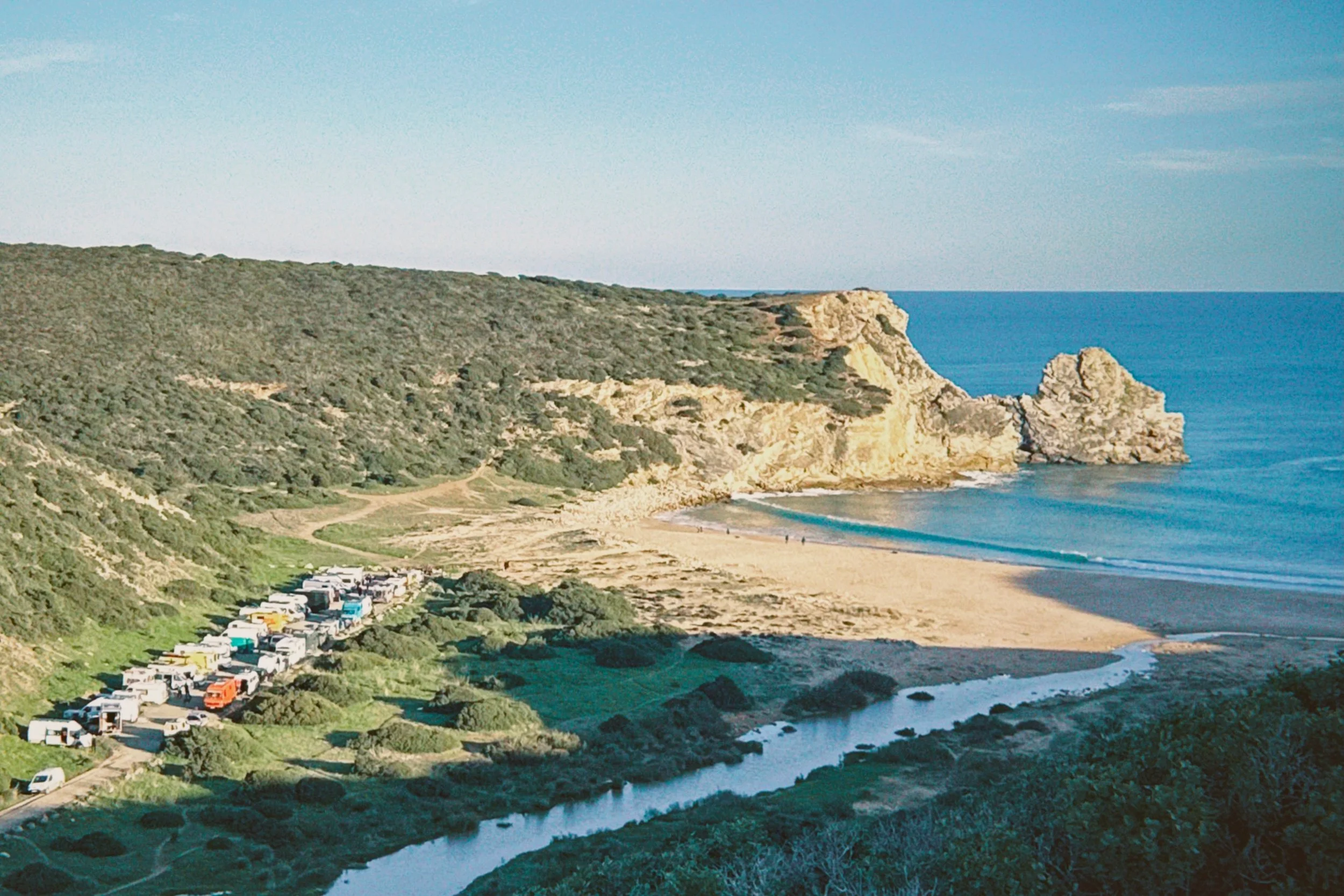 Upon arrival I was greeted by a group of people situated around a fire, playing guitars, passing around joints, sipping wine, and sharing stories. Of course, I couldn’t see much as it was already late. The morning after, though, the paradise revealed itself: a long parking lot hosting some 40+ vans in every possible configuration imaginable, situated next to a river which flows through a beautiful sandy beach hidden in an alley between two cliffs.
